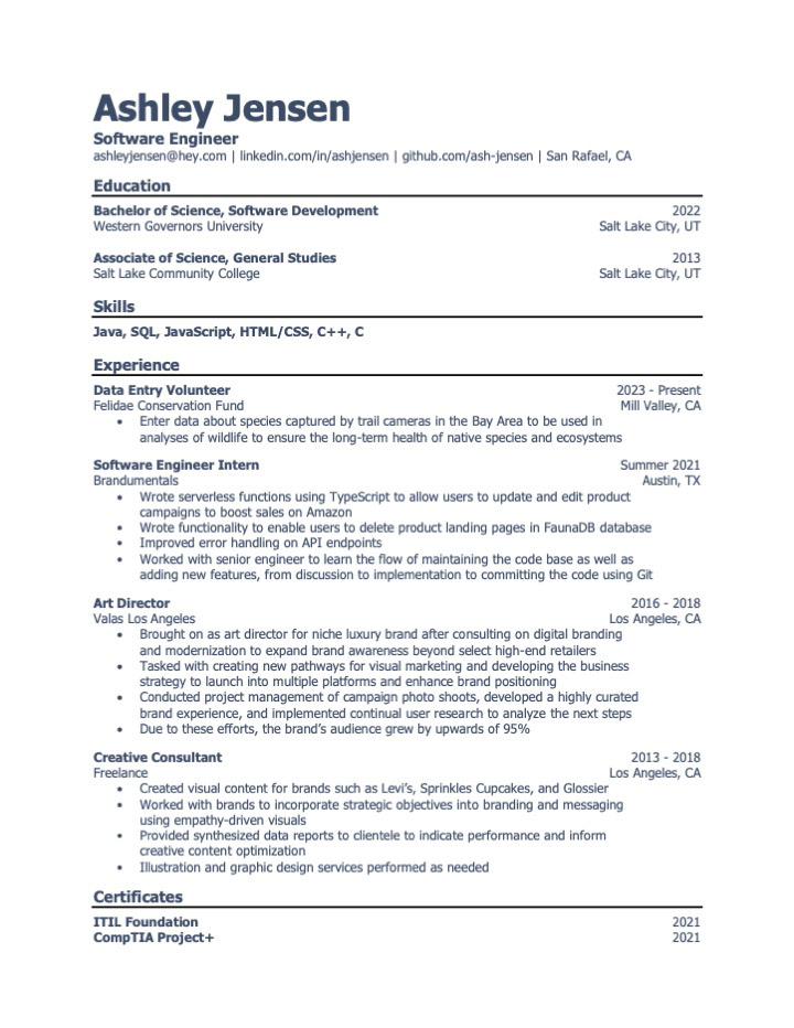 Former art director turned software developer. I started my journey heading for the world of UX/UI, where I was required to take some basic coding classes. To make a long story short, it was quickly determined that the world of programming is where I belong! The more I learned, the more I wanted to know, and here I am a few years later with a bachelor's in software development.